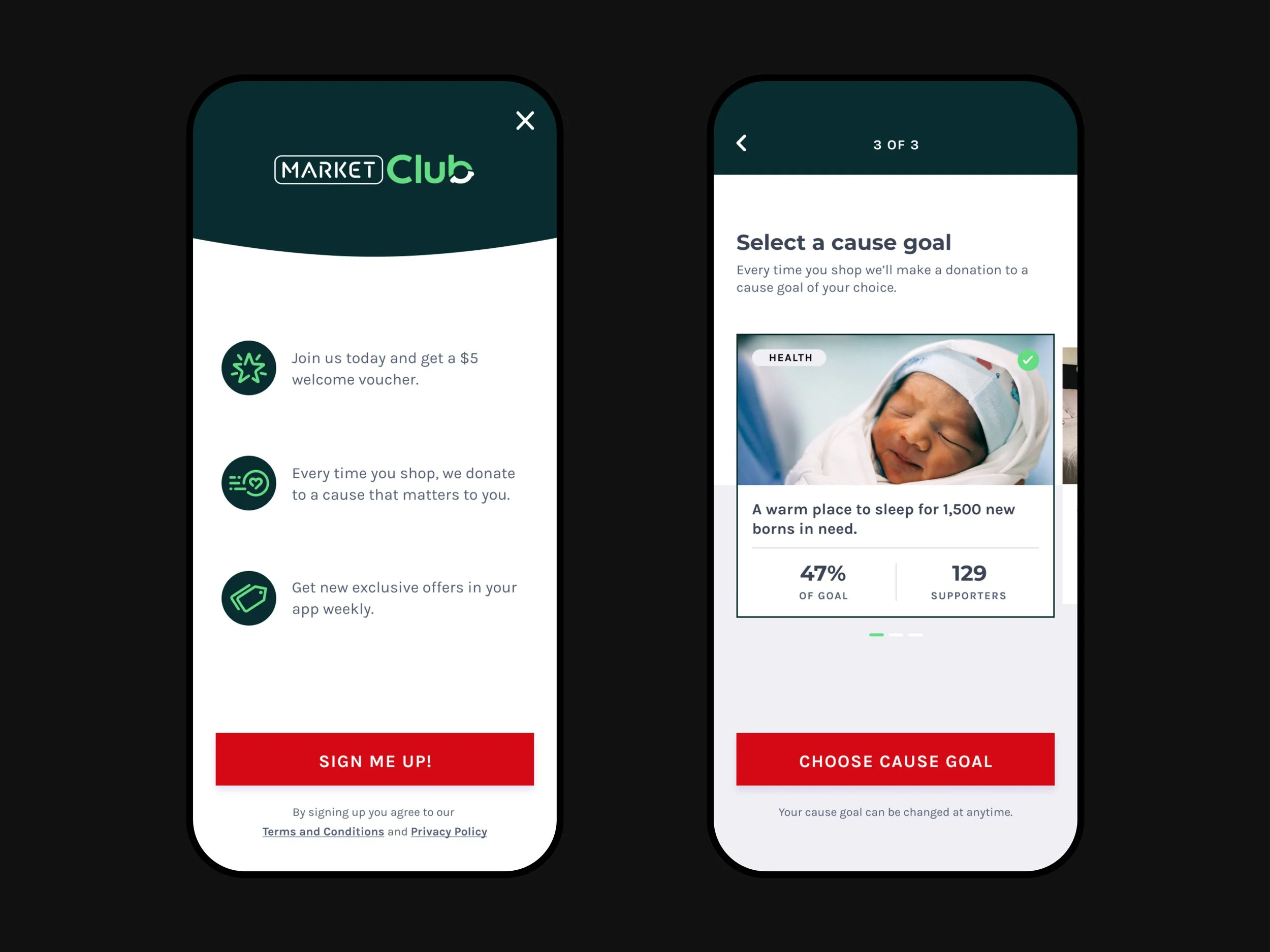 Every dollar spent by the club members, TWG gives a donation to a cause the customer selects. To show the impact each customer has they can view their cause goal, the other cause goals TWG is supporting, and the past goals achieved through the club in the overlay layer. Along with this, each time a purchase is made, the order summary screen reminds them of their cause goal and the progress this is making thanks to the members of MarketClub.