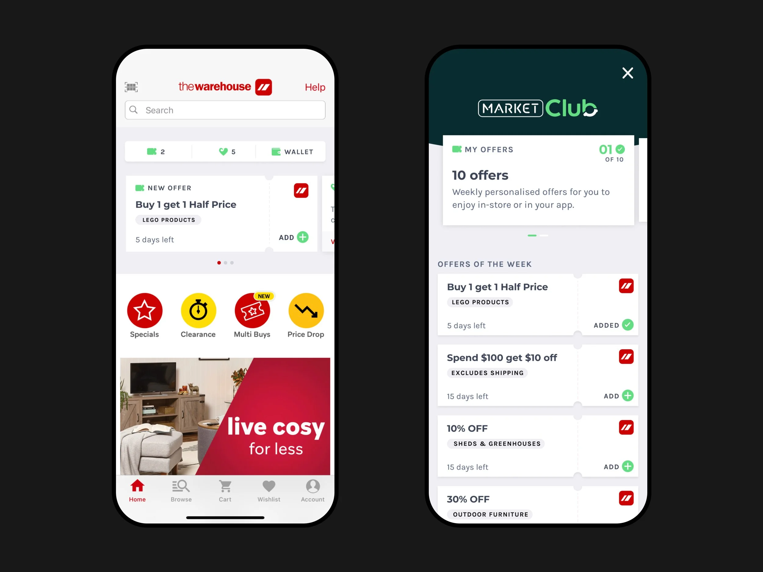 For the MVP, the club would launch in TWG's biggest brand, The Warehouse, but we had to consider the multiple brands and how this club would extend out after the initial launch. This was a tight collaboration between technology and design as we had to cater for multiple platforms and codebases. To make this seamless we designed two layers: the retail layer, the brands e-commerce experience with small modules of the club throughout the shopping journey, and the overlay, a web app that overlays the e-commerce experience and allows the customer to access their club offers and information.